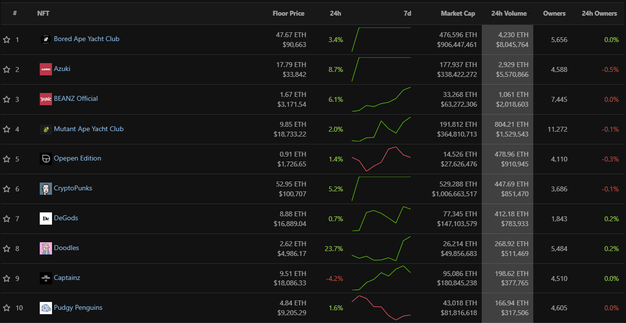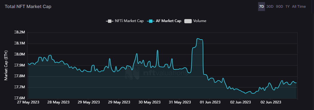 Desde a nossa última edição do NFT Leaks, o market cap agregado do mercado de NFTs na rede Ethereum saiu de ETH 7,92MM para ETH 7,74MM (-2,2%). Em dólares, porém, observou-se um pequeno aumento de $14.45B para $14.72B (+1,8%).