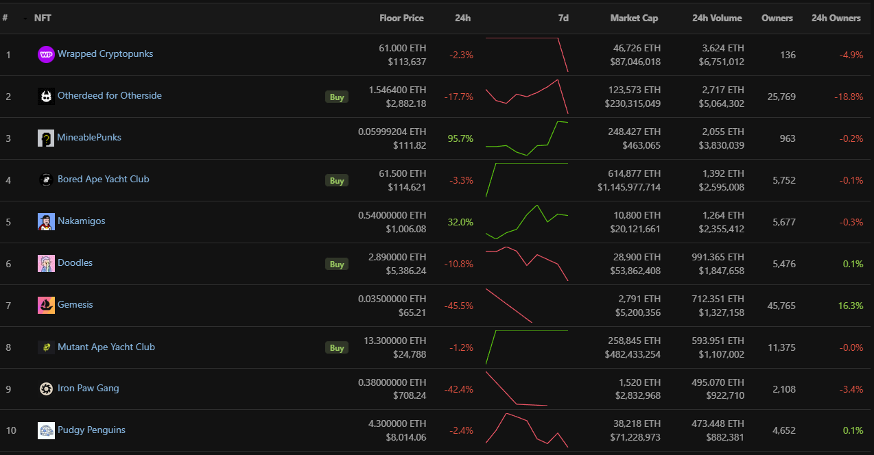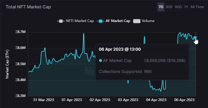 Desde a nossa última edição do NFT Leaks, o market cap agregado do mercado de NFTs na rede Ethereum saiu de ETH 8,5MM para ETH 8,7MM (+2%). Em dólares, isso representa um aumento de $15,69B para $16,52B (+5%).