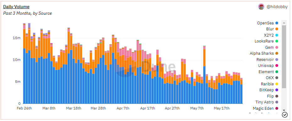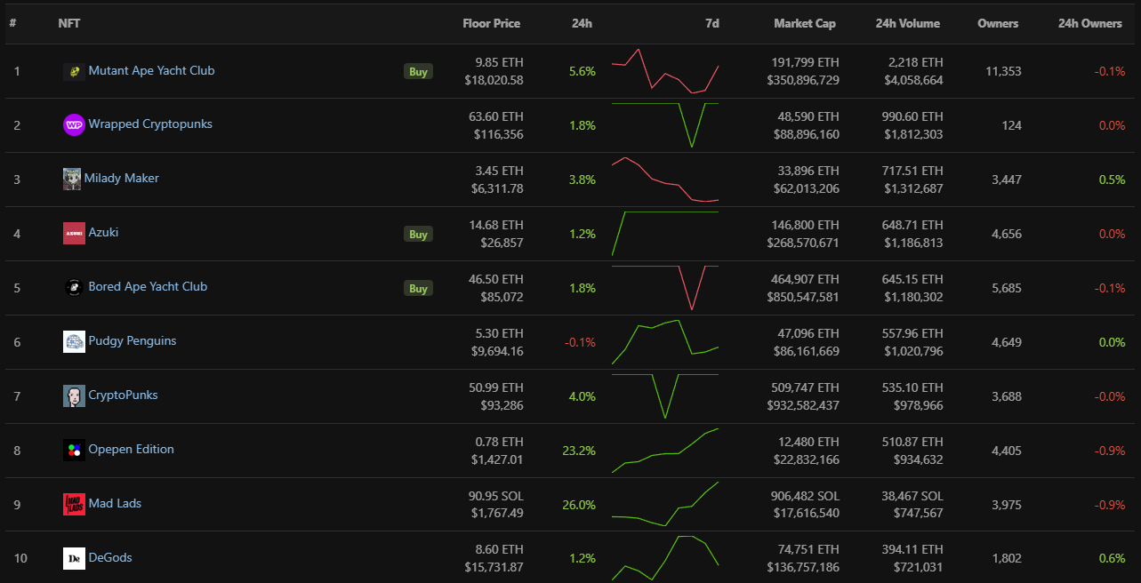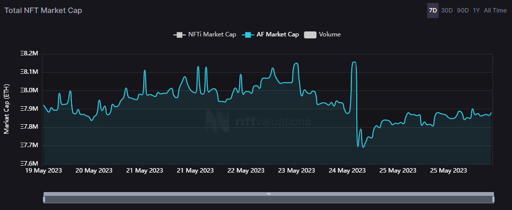Desde a nossa última edição do NFT Leaks, o market cap agregado do mercado de NFTs na rede Ethereum se manteve em ETH 8MM. Em dólares, porém, observou-se um pequeno aumento de $14.67B para $14.80B (+0,9%).
